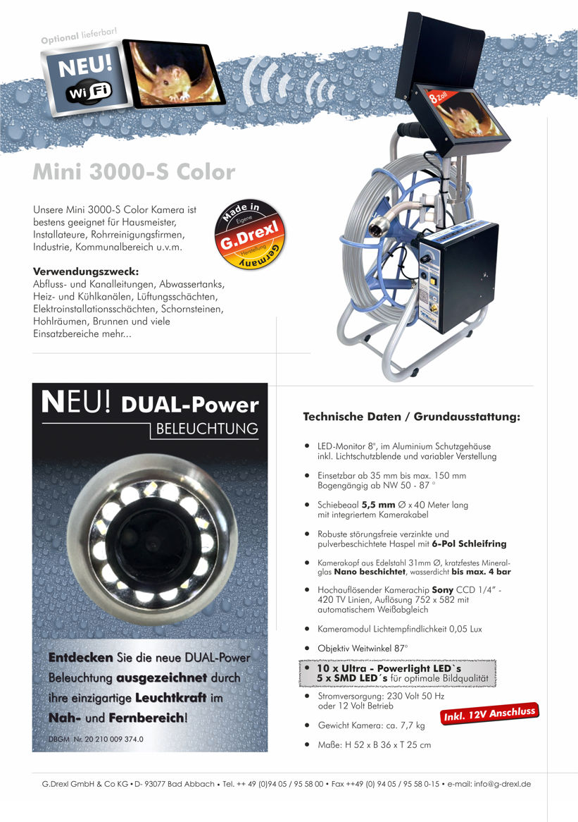 Als Hersteller hochwertiger Rohr- und Kanalkameras bieten wir Ihnen Qualität Made in Germany. Unsere Mini 3000-S Color Rohrkamera überzeugt durch ein durchdachtes Design, modernste Technik und langjährige Erfahrung in Entwicklung, Vertrieb und Service.